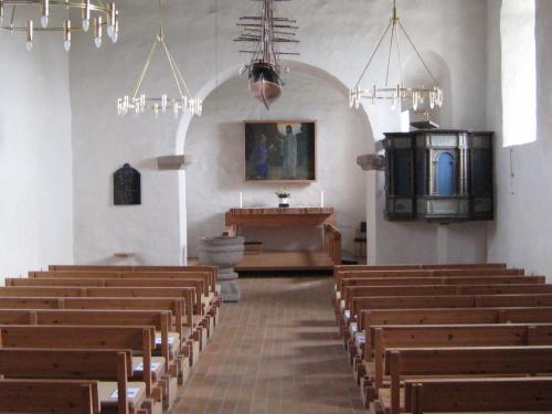 befinden sich am Grab der Unbekannten am südlichen Teil des Friedhofes. Beide Kunstwerke stammen von Laila Vestergaad. Auf den Aussenmauern der Kirche befinden sich eine Reihe Quardersteine mit Steinmetz-Zeichen - insgesammt 18 Dreiecke und Vierecke - deren Bedeutung bis heute ungewiss ist. Die Kirche stammt aus dem 12. Jahrhundert , das ursprüngliche Granittaufbecken wird auch heute noch