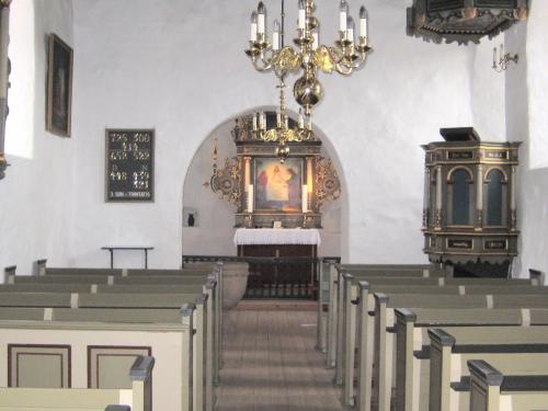 das Schiff eine Balkendecke hat. Die Altartafel ist eine Renaissance-Schnitzerei